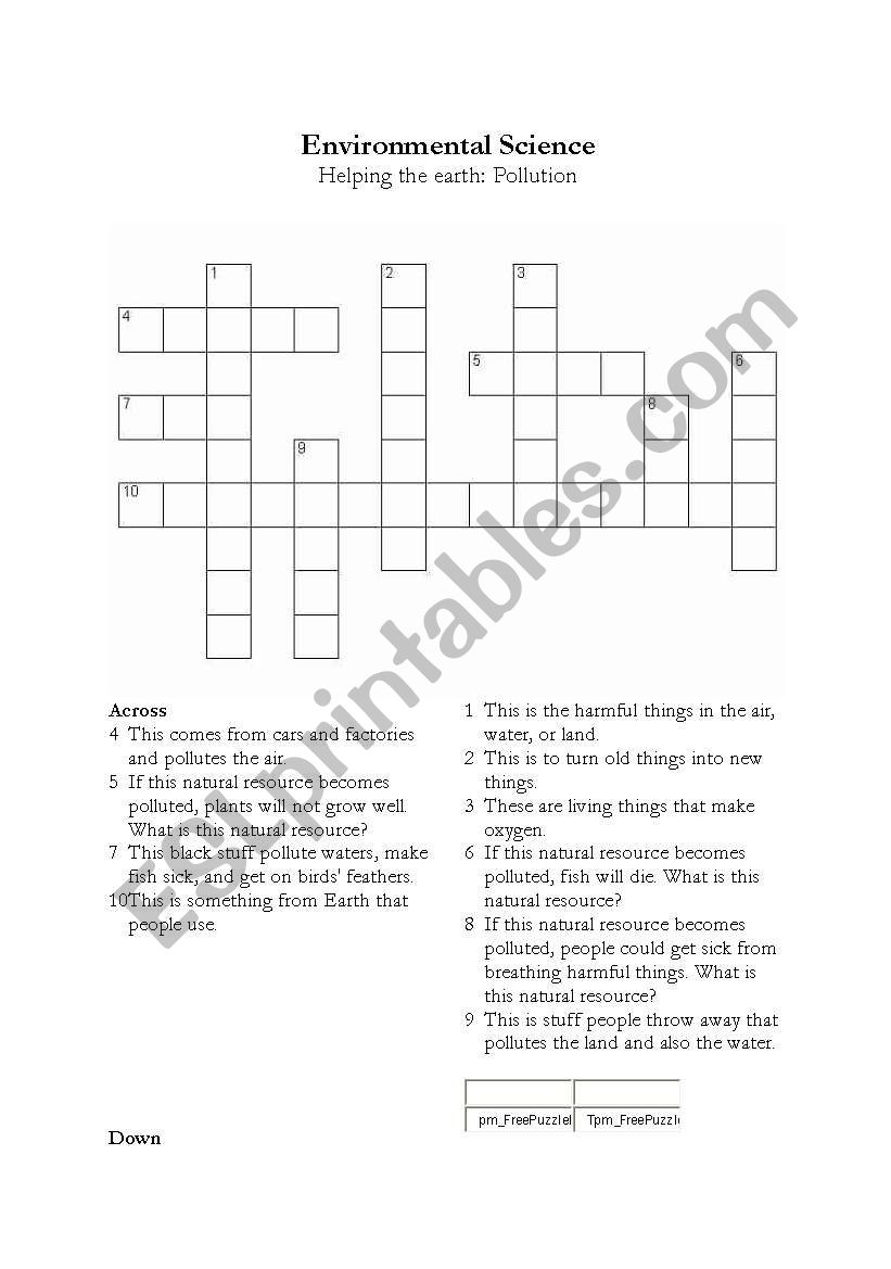 English Worksheets Science Pollution Crossword