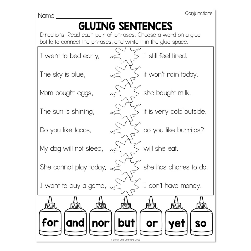 Grammar Worksheets Conjunctions Gluing Sentences Lucky