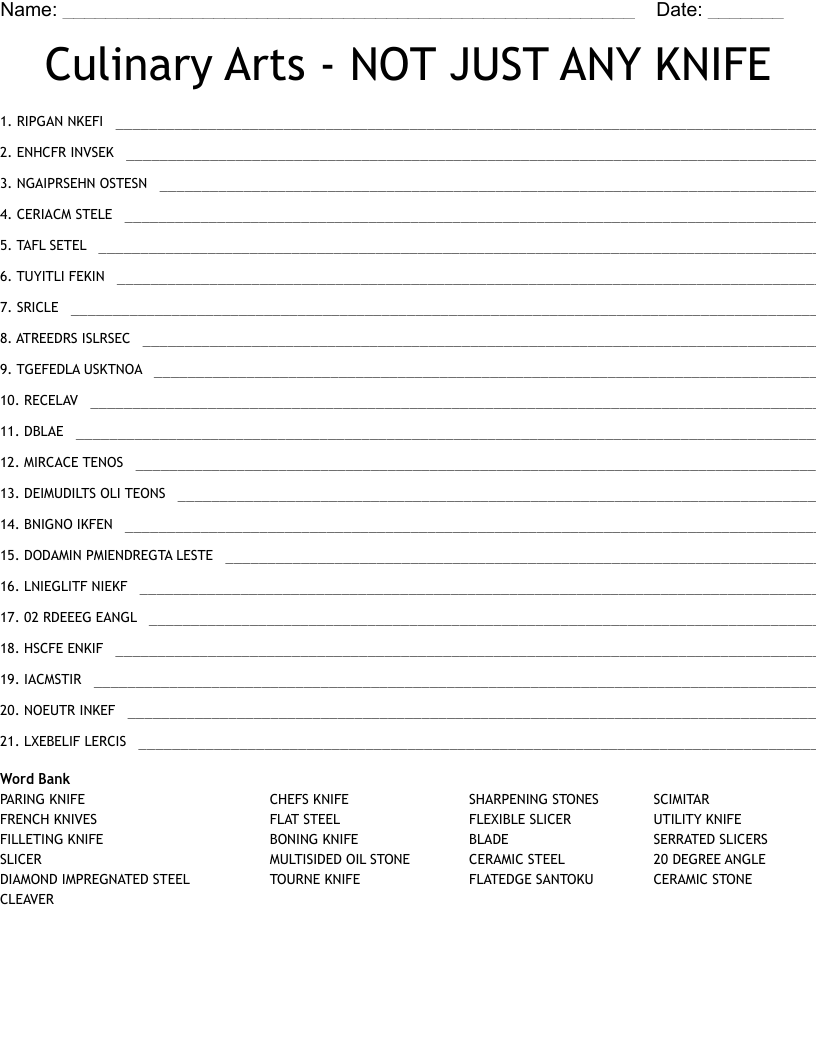 Culinary Arts NOT JUST ANY KNIFE Word Scramble WordMint