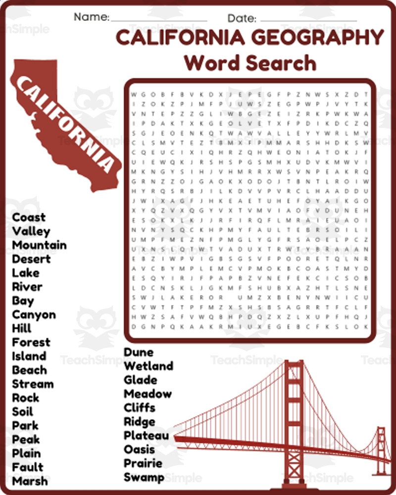 CALIFORNIA GEOGRAPHY Word Search Puzzle Worksheet Activity Bell