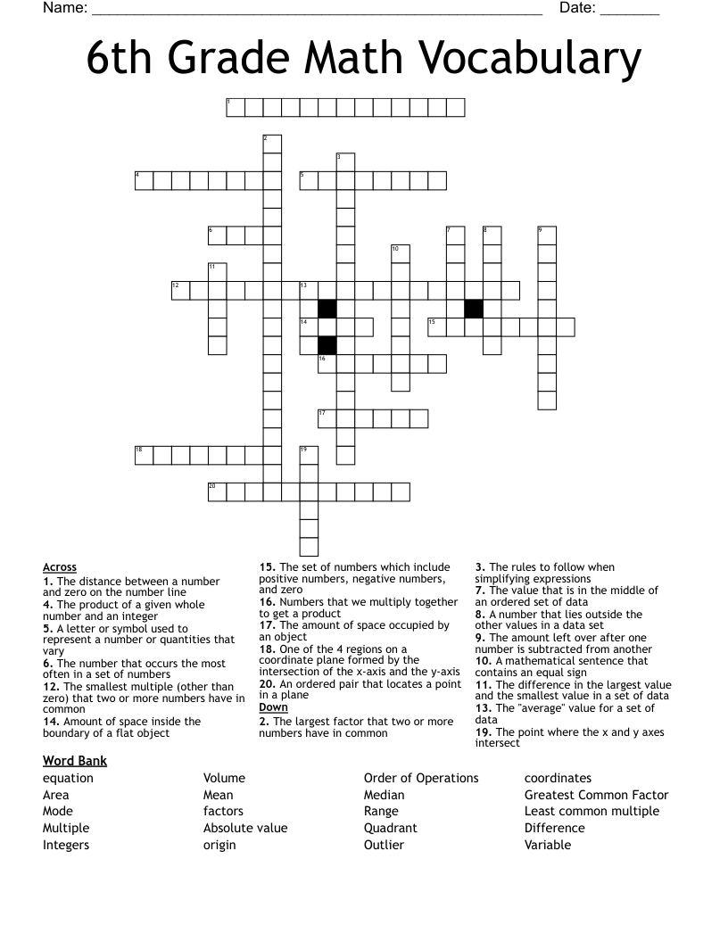 6th Grade Math Vocabulary Crossword WordMint