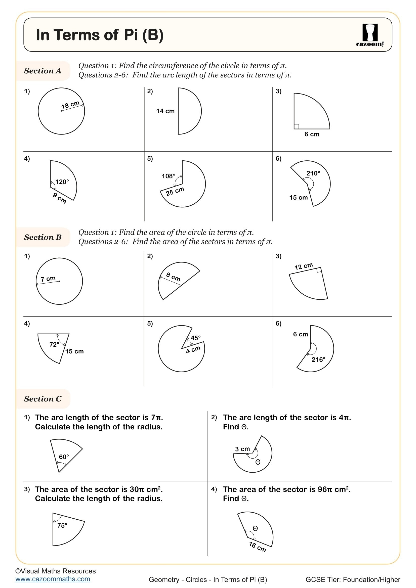 In Terms Of Pi B Worksheet Printable PDF Year 9 And Year 10 Geometry Worksheet