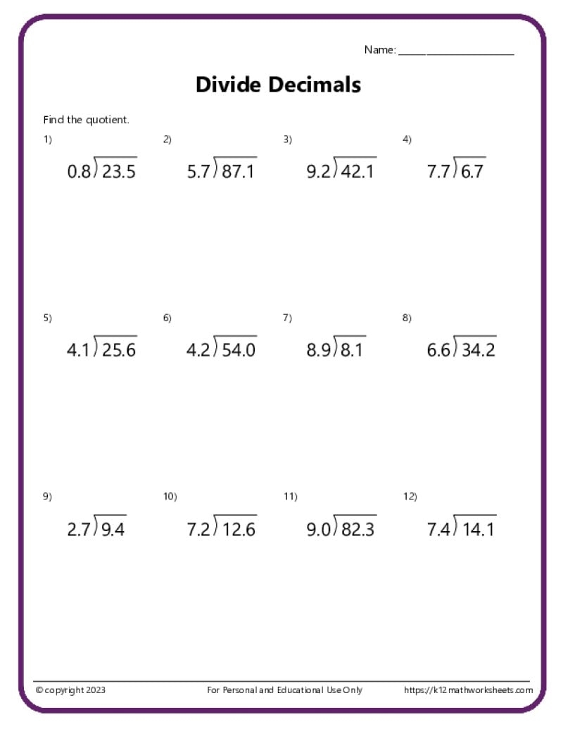 Division With Decimals Worksheets K12 Math Worksheets