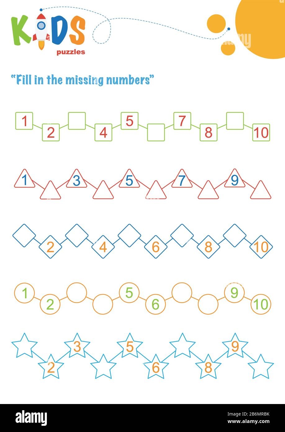 Fill In The Missing Numbers Counting Worksheet Easy Colorful Math Puzzles For Preschool Elementary And Middle School Kids Stock Vector Image U0026 Art Alamy