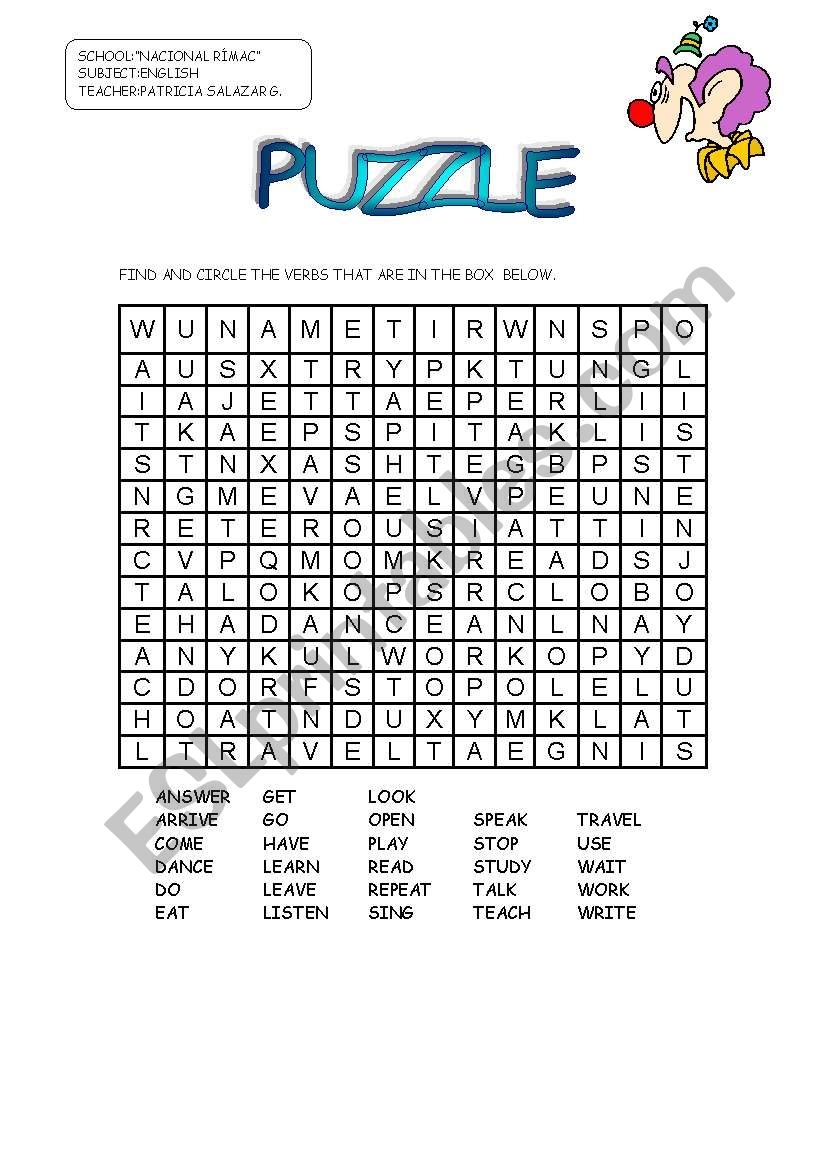 PUZZLE VERBS ESL Worksheet By Patricia Elvira